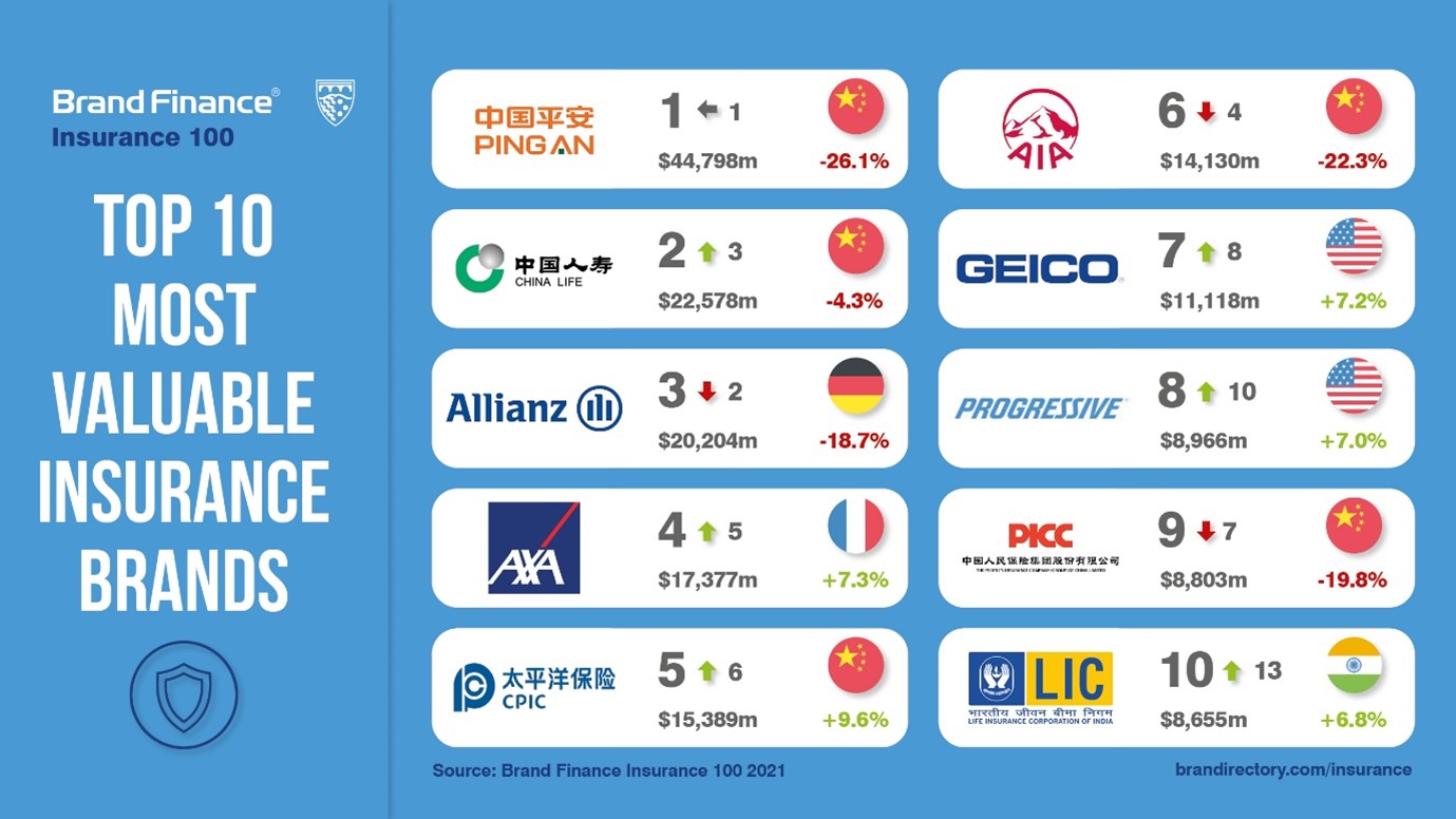 Công ty tư vấn định giá thương hiệu Brand Finance vừa công bố danh sách các thương hiệu bảo hiểm hàng đầu thế giới. Hãng bảo hiểm Ping An của Trung Quốc vẫn giữ vị trí là thương hiệu bảo hiểm giá trị nhất toàn cầu, trong khi Bảo hiểm China Life đã vươn lên vị trí thứ hai, thay thế Bảo hiểm Allianz từ Đức.