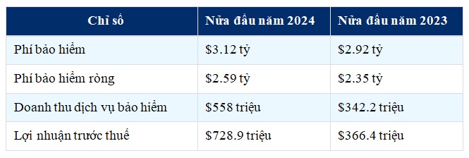 Tổng phí bảo hiểm trong 6 tháng tính đến ngày 30 tháng 6 bao gồm 577,8 triệu USD (khoảng 14,39 nghìn tỷ VND) từ mảng rủi ro mạng; 126,8 triệu USD (gần 3,16 nghìn tỷ VND) từ mảng kỹ thuật số; 506,9 triệu USD (khoảng 12,6 nghìn tỷ VND) từ mảng rủi ro MAP (hàng hải, tai nạn và chính trị); 1,01 tỷ USD (khoảng 25,1 nghìn tỷ VND) từ mảng rủi ro tài sản và 903,4 triệu USD (khoảng 22,5 nghìn tỷ VND) từ mảng rủi ro chuyên biệt.