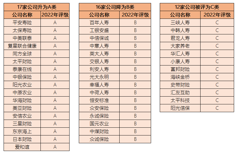 太保寿险此前6年评价均为A类,在2021年度降为B类,2022年度又重新上升为A类。平安寿险、中美联泰、同方全球、复星联合健康等公司评级也上升为A类。